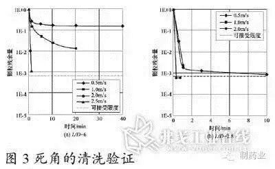 清洗效果与系统死角密切相关,死角的清洗验证表明(图3):适当增加系统流速对清洗效果影响显著;同时,系统死角控制的越小,所需的清洗流速越低。为保证制药配液系统有一个良好的清洗效果,企业需严格遵从“3D死角原则”,例如,生物制药行业常采用无死角的多通路阀门设计理念来有效杜绝系统交叉污染。工程上,清洗流速一般控制在1.5~2m/s,清洗流量经验值一般为4~12L/min/m2(罐体内表面积)。