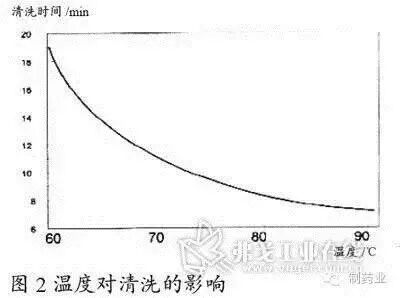 研究表明,温度每升高10℃,化学反应速度会提高1.5~2倍,清洗速度也会相应提高。图2显示了清洗温度与清洗时间的关系,适当增加温度有助于节省清洗时间,当温度超过80℃后,清洗时间基本无变化,因此,综合能耗与清洗效果综合考虑,CIP程序常选择60~70℃为标准清洗温度。