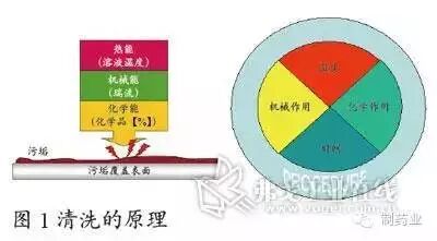 清洗的主要原理是向设备表面的残留物施加热能、机械能和化学能,在这些能量的共同作用下实现设备的清洗。温度、机械作用、化学作用和时间是清洗过程中的4个基本要素,为实现清洗的目的,上述4个要素缺一不可且相互影响、互为补充,见图1。