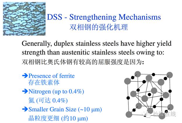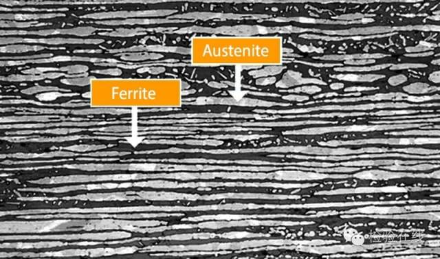 双相不锈钢(Duplex Stainless Steel,简称DSS),指铁素体与奥氏体各约占50%,一般较少相的含量最少也需要达到30%的不锈钢。在含C较低的情况下,Cr含量在18%~28%,Ni含量在3%~10%。有些钢还含有Mo、Cu、Nb、Ti、N等合金元素。